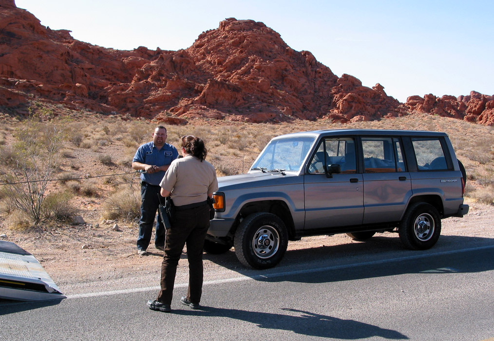 To make a long story short, I get picked up, taken to the park entrance gate, where the cute blond rangerette is very helpful, calls a tow service for me, and arranges for a ride back to the Trooper. Mr Tow Truck Driver shows up (thankfully Ihave towing insurance) and we're off to Overton, Nevada, the closest town, 26 miles away. We get there about 4:45, and drop the Trooper off at an auto shop, where the owner promises to look at it in the morning.