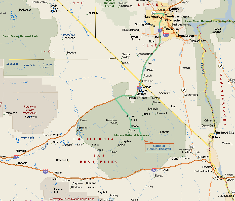 After another less-than-exciting night at the Orleans Hotel and Casino, during which I consigned a quick $20 to the slot machines, the Trooper is finally repaired - another new clutch - and I'm ready to go again. On the way out of town I stopp for another quick visit with Jeff and Susan to see their place, then join them for lunch and a mocha at a local coffee shop. Then, about 2:30 PM, I hit the road heading south on I-15 with the Mohave National Preserve as my intended destination.