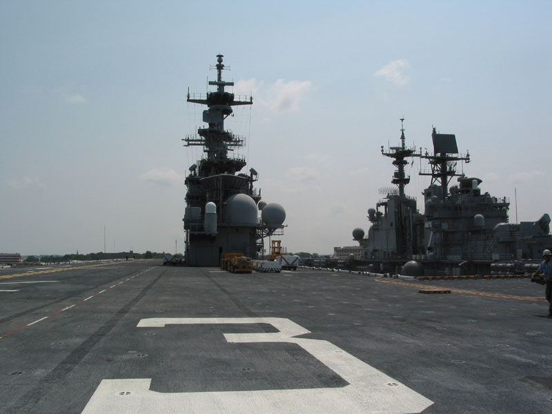 The flight deck looks much like that of a conventional carrier, although this ship only handles, as Pete put it, "things that hover". There is no catapult for launching fixed-wing aircraft, and no arresting mechanism for catching a landing plane. However, I bet I could get a Cessna or a Kitana on and off this thing without too much problem.