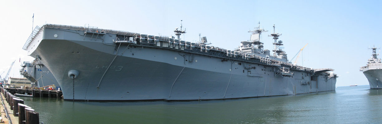 The USS Kearsarge (LHD-3) is a Wasp class amphibious assault ship, of which there are currently seven in the US Navy. She is 844 feet long, displaces a little of 40,000 tons loaded, has a crew of over 1100 seamen and officers, and transports a detachment of almost 1900 marines along with their tanks, trucks, artillery, APC's, landing craft and hovercraft. She also carries almost 50 helicopters and up to 5 AV-8B Harriers. (Follow links at the beginning of this paragraph for more details).