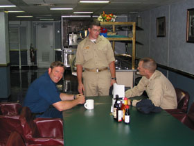 Here's Pete (seated left) Nick (standing) and a gentleman whose name I do not remember, but if I remember correctly, was either commander of the air wing, or one of the air wing senior officers. Pete was CDO (Command Duty Officer) that day which means her was the captain's representative and basically in charge of the ship. In spite of this, he (and Nick) gave me quite an extensive tour.
