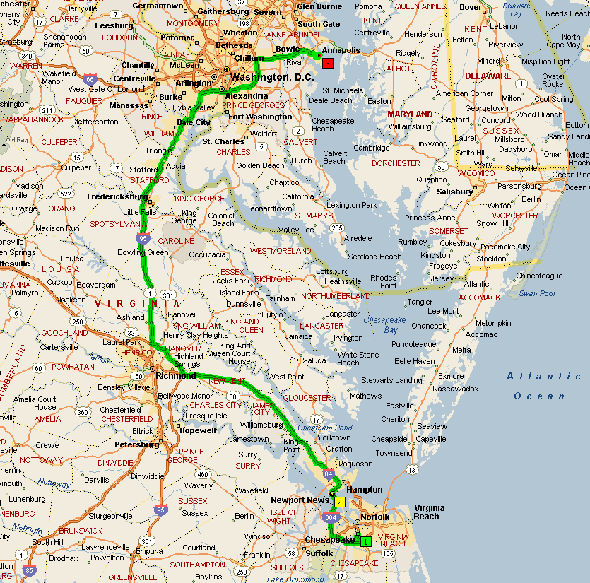 I left Pete's house in Chesapeake about 3:00 in the afternoon. I was going to wait for him to return from his ship, but as CDO he got tied up with some things. We did talk on the phone though, and hopefully we'll get to hook up sometime in PA.