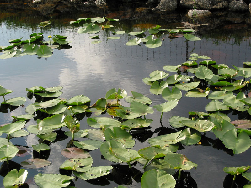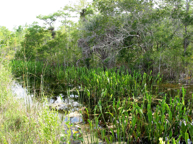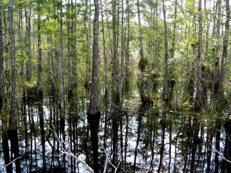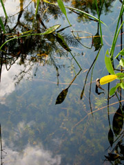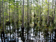 I always thought of swamps as places where the water is murky and fetid, filled with decaying debris and eminating large quantities of swamp gas. The water here was actually very clear. The picture to the left shows this well. Although the sky reflects off the surface in this shot, you can easily see the aquatic plants below the surface of the water, which was about 18 inches deep. I figured if I could see these plants, I could see an alligator.