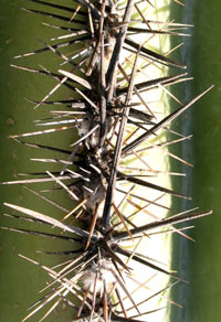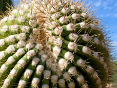 In the spring, white blossoms sprout in rings around the top and ends of the arms. The flowers are pollinated by birds, insects and bats. In June and July, the fruit ripens to a deep red. The fruit is called pitahya, and it is delicious - I know, I've eaten enough of it, and it has been a staple in the diet of local natives probably for as long as humans heve been here. Actually, the fruits of all species of cactus in the desert are edible.