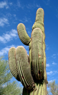 In the course of its lifetime, each saguaro becomes a mini-ecosystem in its own right. Hawks and eagles build nests in the arms. Smaller birds actually tunnel through the extremely tough cuticle (skin), burrowing out little caverns in which to nest. The plant forms a callous that lines the borrow, making it usable for pretty much the entire life of the cactus.