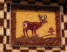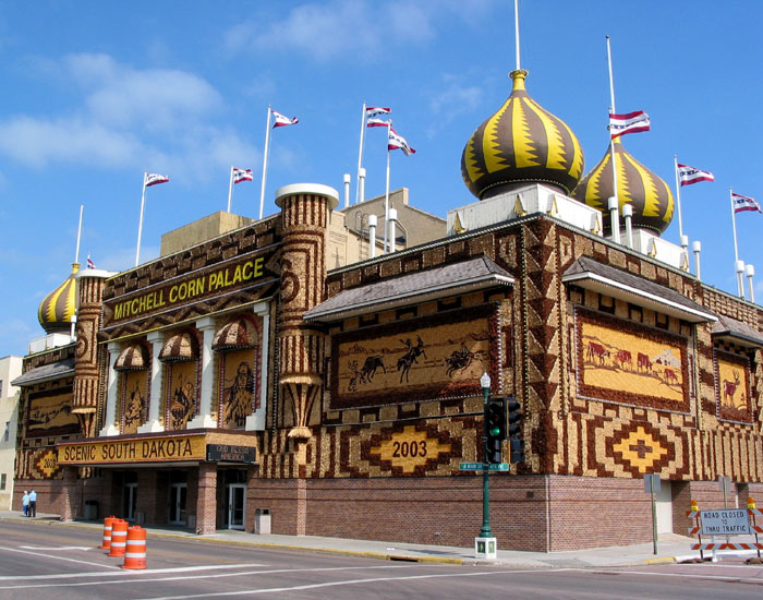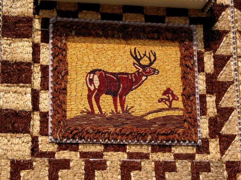 Well, here it is. It's actually the town civic center, with a basketball court, auditorium and of, of course, the Corn Palace Museum inside. It was originally built in 1892 a few blocks from this location (for the purpose of "putting mitchell on the map"), then moved and rebuilt a few times due to fires and other things. The entire external facade, and a great deal of the interior, is composed of murals made from various parts of the corn plant and other locally grown grains.