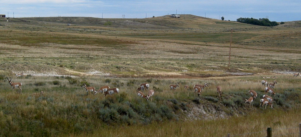 The pronghorn were impossible to get close to. At the slightest suggestion of an approach, they would turn tail and begin moving away. Strangely, they are most visible in retreat. Most of there bodies are brown, with black and white markings on their face, and white bellies. Their rumps, however, are large, bright, white target-shaped markings. When they turn away from you and run, you see are big white round shapes bounding across the prairie, but much more visible than from the front or side - it's a marking that says "here I am, I'm running away, come chase me" - I'm not quite sure what the adaptive advantage of this is - except that they are very fast, and maybe predators (mountain lion, and in the past probably wolves) have learned to read this signal as "this thing's too fast, lets not even bother wasting our energy".